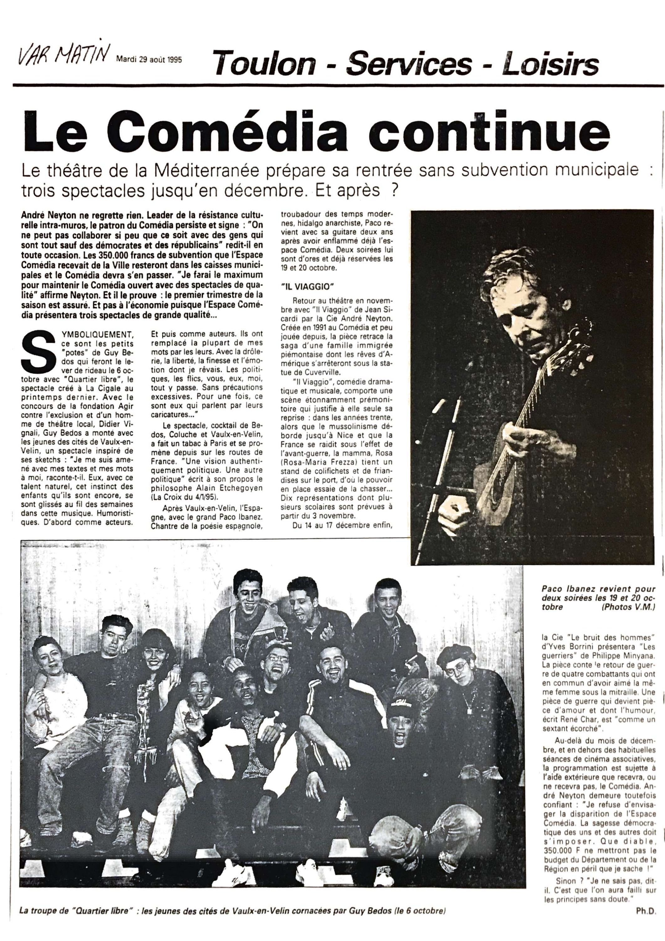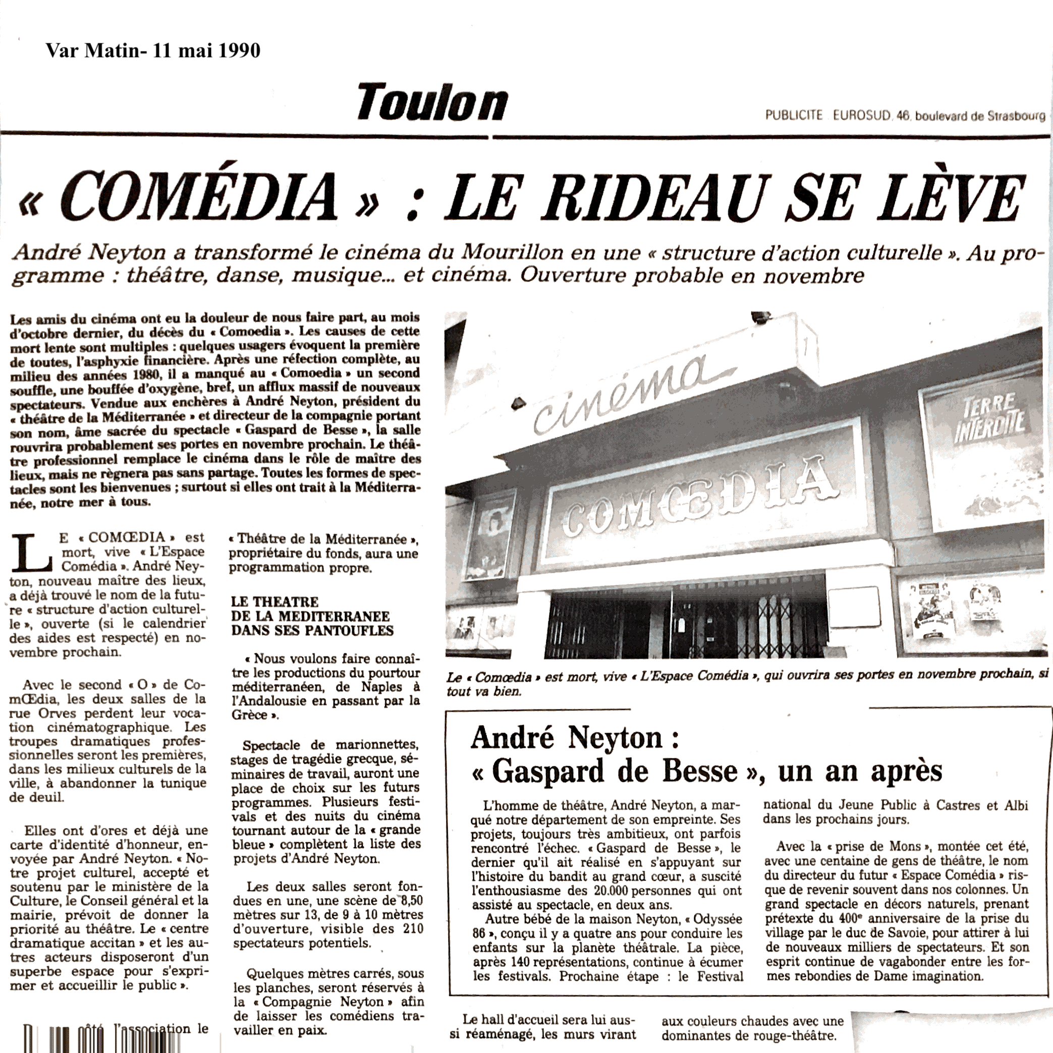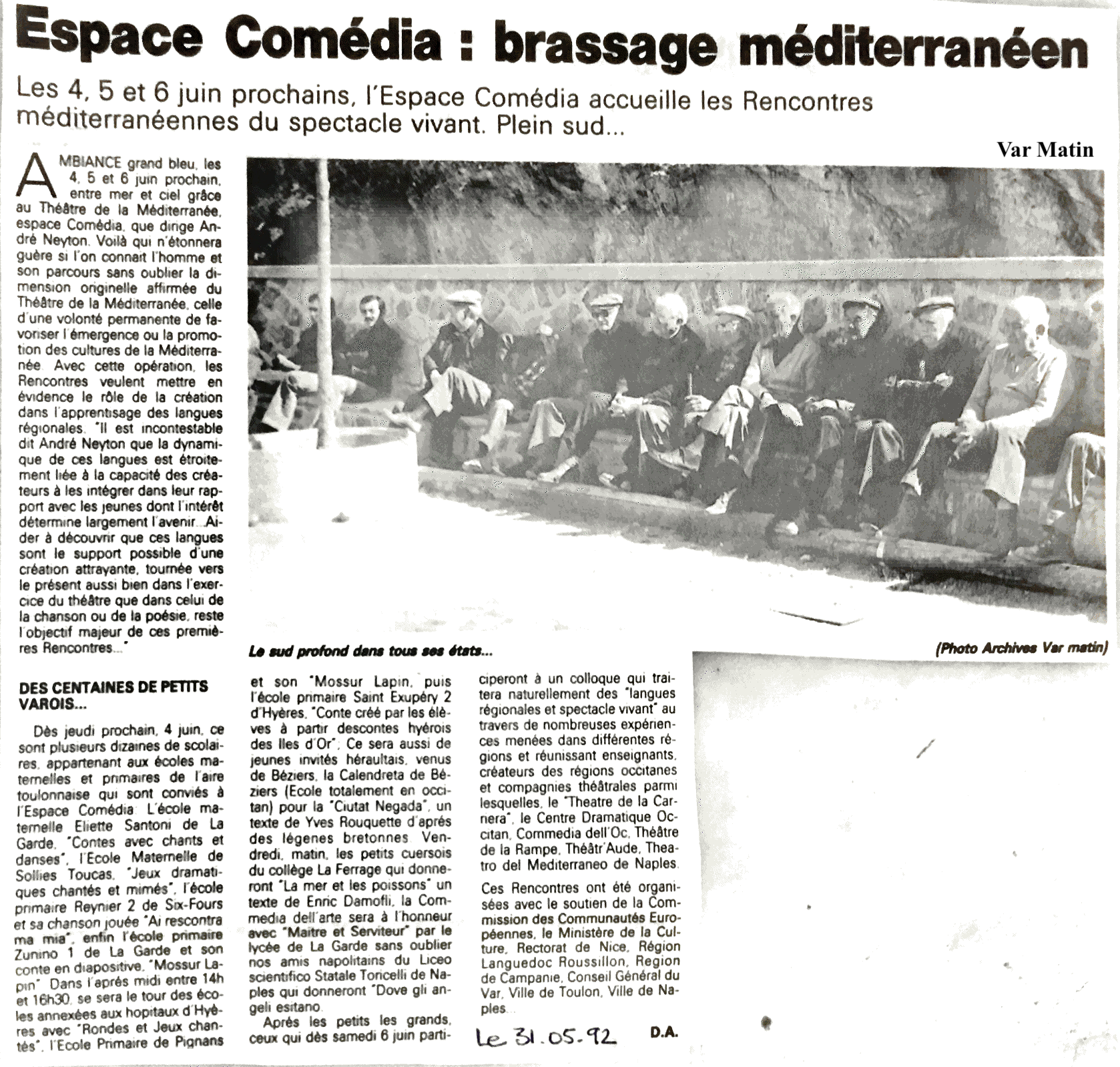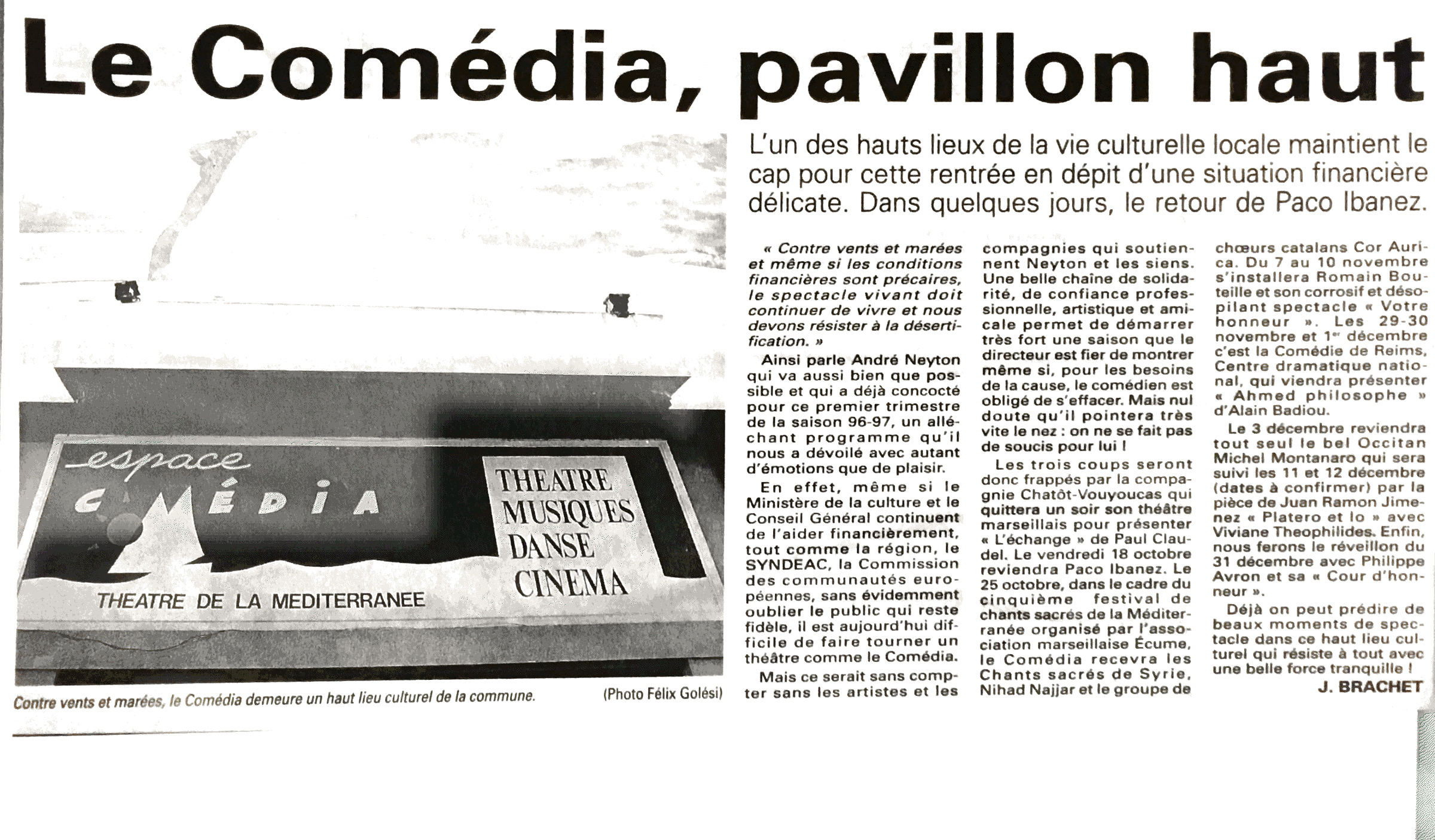 Vous trouverez ici de façon non exhaustive, certains articles de Presse concernant l'Espace Comédia et le Théâtre de la Méditerranée