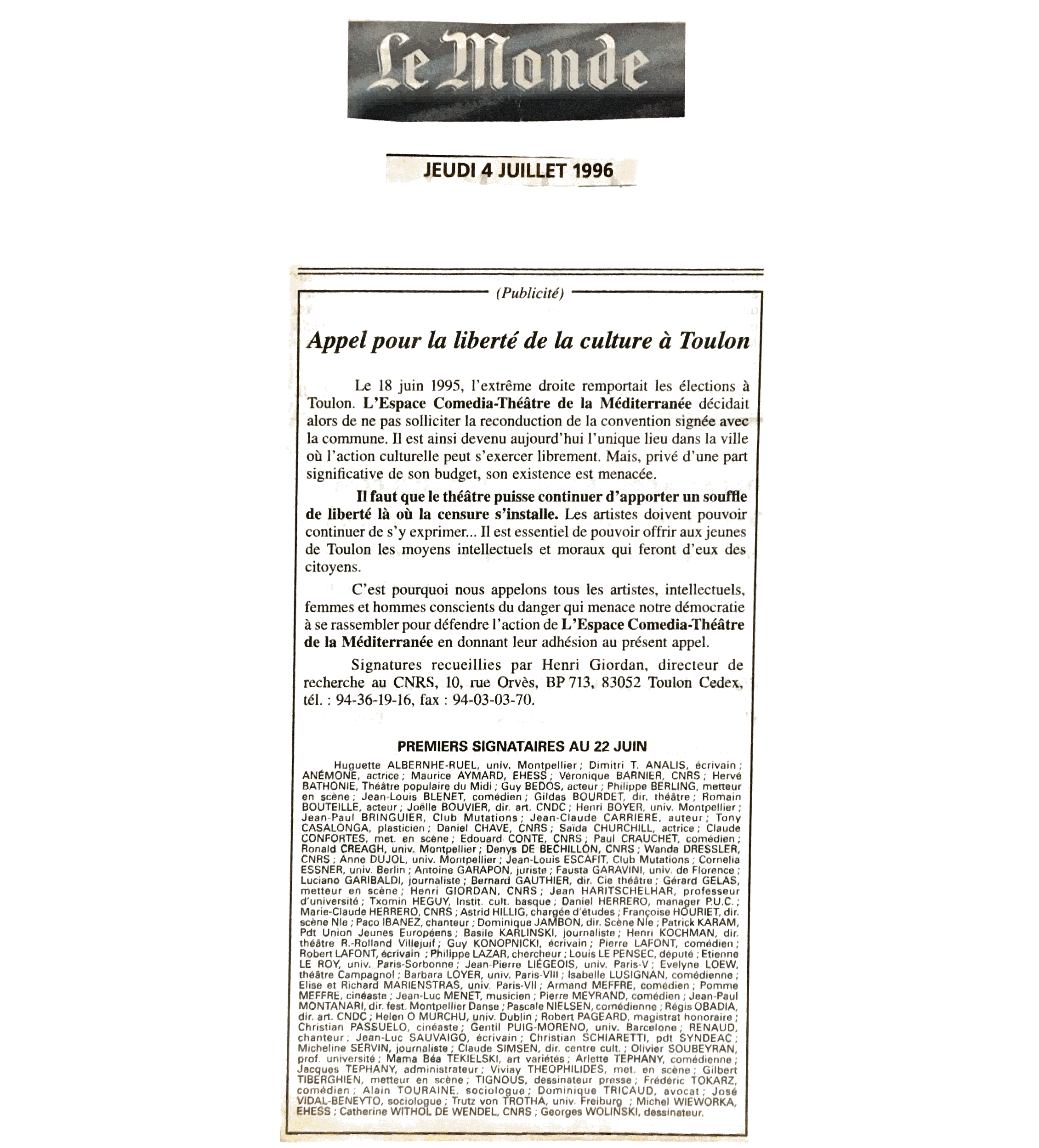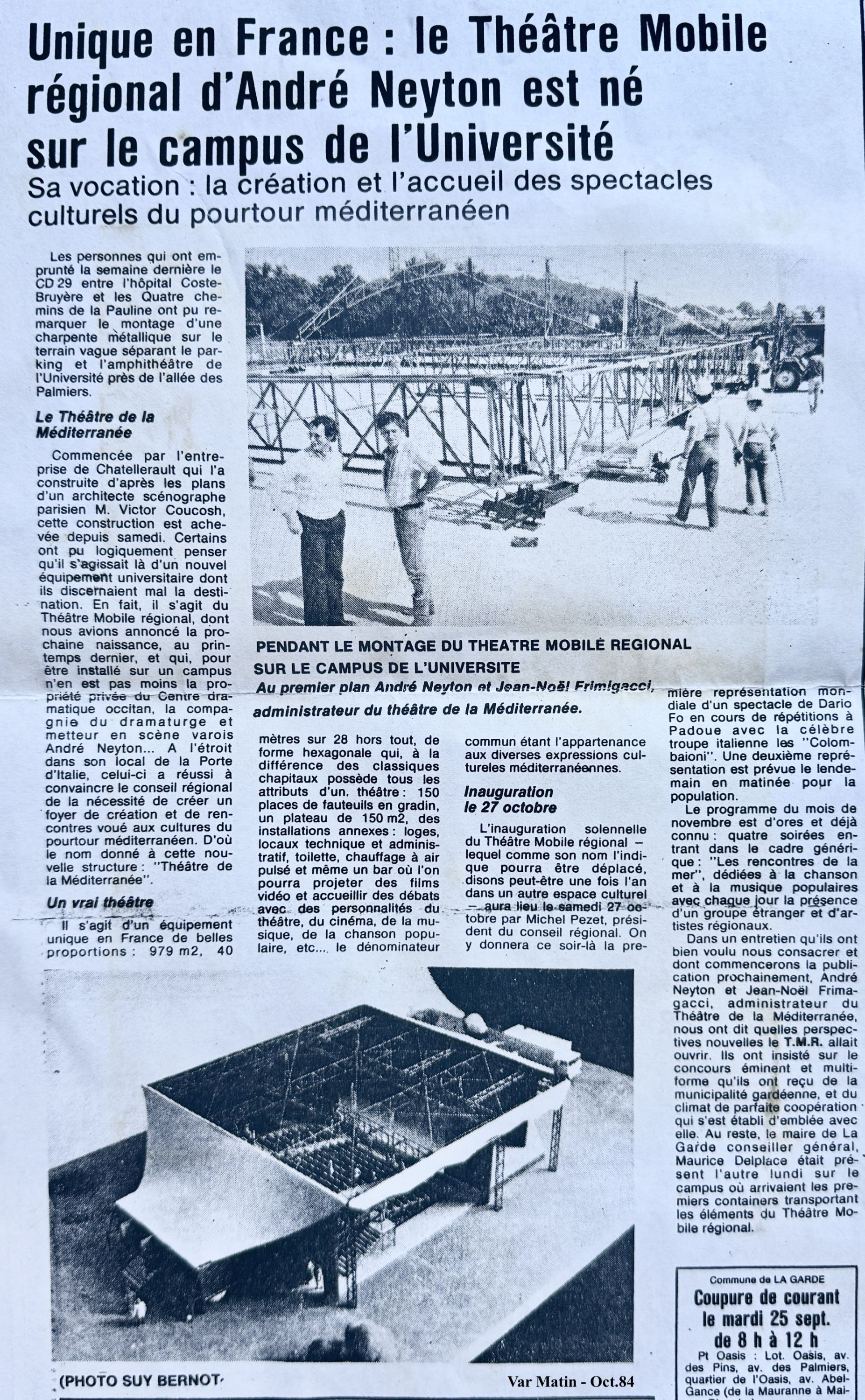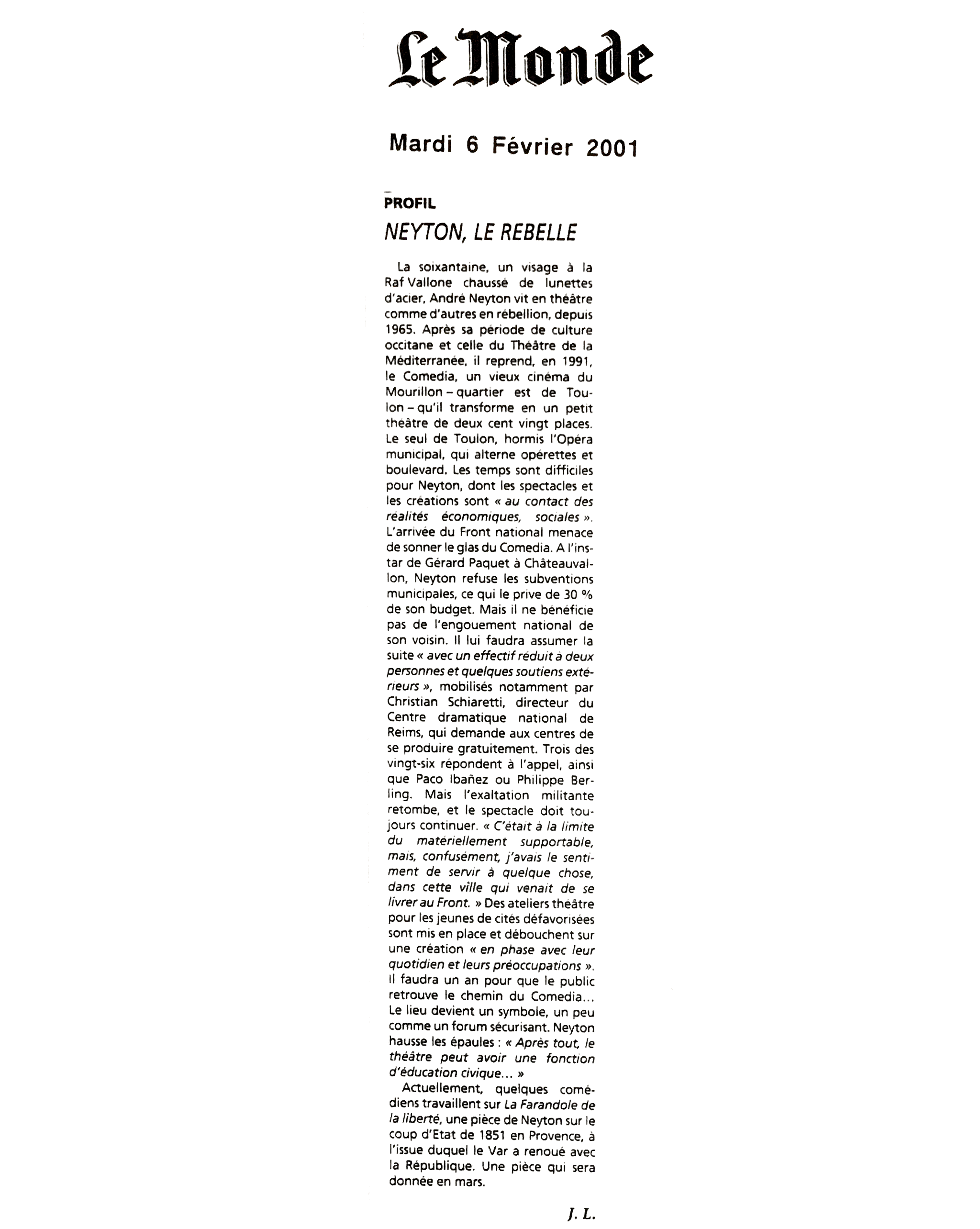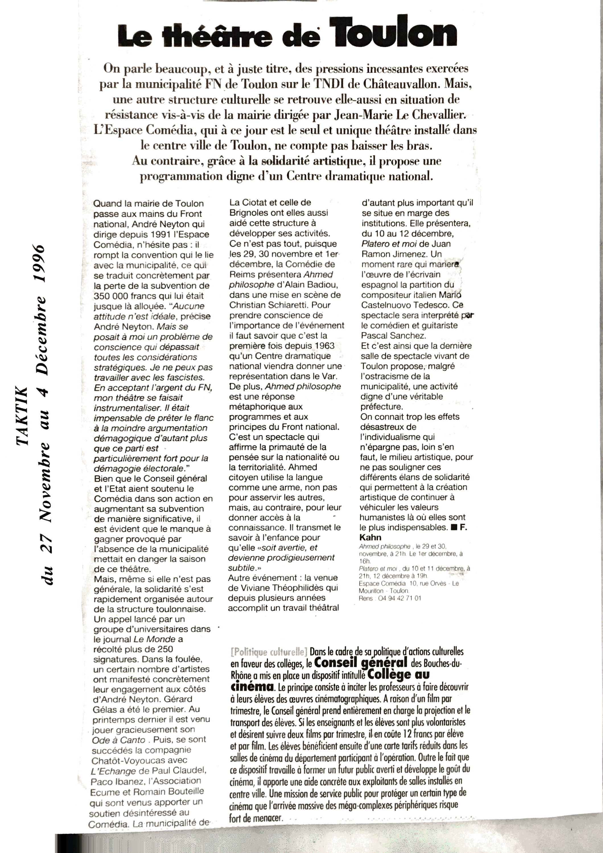 Vous trouverez ici de façon non exhaustive, certains articles de Presse concernant l'Espace Comédia et le Théâtre de la Méditerranée