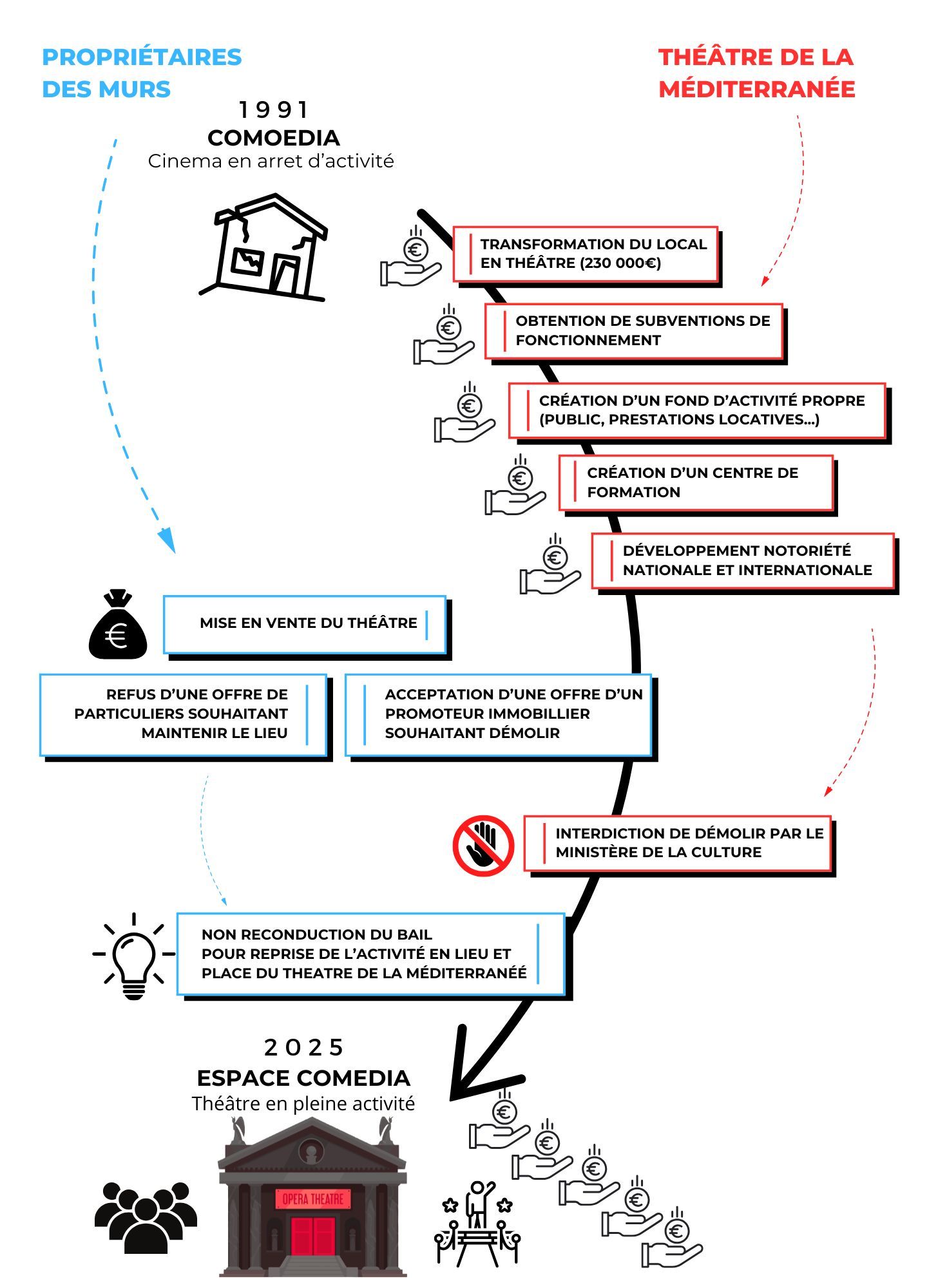 L'opération immobilière avortée, les propriétaires, n’ayant jamais travaillé dans le milieu du spectacle, décident alors, sous couvert de récupérer les murs, de récupérer à leur compte l’activité du théâtre, en lieu et place du Théâtre de la Méditerranée.